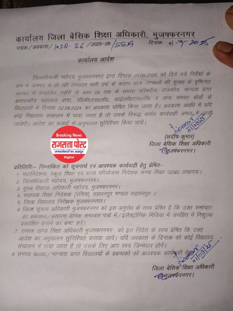 लगातार 6 घंटे की भारी बारिश के कारण मुजफ्फरनगर जिले में बेसिक शिक्षा अधिकारी संदीप कुमार के आदेश के अनुसार दिनांक 2 सितंबर 2025 को कक्षा 1 से 8 तक के सभी प्राथमिक विद्यालय उच्चतर माध्यमिक विद्यालय का अवकाश रहेगा यह है और कहा है कि इसका सूचना का कड़ाई से पालन होना चाहिए